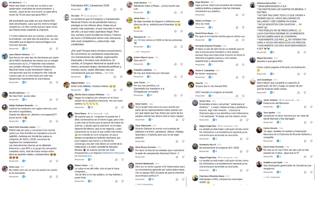 Los comentarios son un retrato feroz de una afición que ya no se traga el discurso del “orgullo nacional”. Las críticas apuntan directo al gobernador Ricardo Gallardo Cardona, a quien acusan de convertir la charrería en su espectáculo personal. “El único millonario es Gallardo y ese compra en Dubái”, ironizó una usuaria. Otros fueron más tajantes: “¿Cuánto les dieron en efectivo o en especie? ¡Puras lacras!”.
