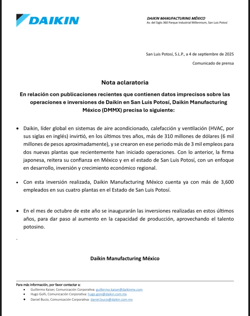 Con este desmentido, Daikin busca blindar su reputación con datos verificables, mientras el Gobierno del Estado insiste en vestir con propaganda lo que la empresa presenta como parte de su plan estratégico de largo plazo.