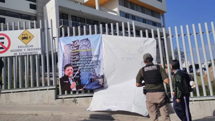 La mañana de este martes amaneció una lona de protesta en la Facultad de Ciencias de la Universidad Autónoma de San Luis Potosí (UASLP), ubicada sobre la avenida Chapultepec. El mensaje estaba dirigido al gobernador Ricardo Gallardo, señalando el incumplimiento de compromisos y trabajos previamente anunciados por el propio mandatario para esa institución.