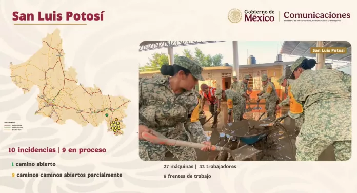 En San Luis Potosí, de las 10 incidencias que ocurrieron debido a las fuertes lluvias, un camino está completamente abierto y nueve están parcialmente abiertos. Informó Jesús Esteva, Secretario de Transportes y Comunicaciones de México, en la conferencia matutina de la Presidenta Claudia Sheinbaum.