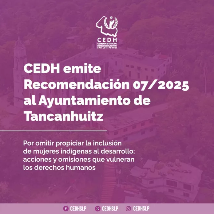 La Comisión Estatal de Derechos Humanos de San Luis Potosí emitió la Recomendación 007/2025 dirigida al Ayuntamiento de Tancanhuitz, por violaciones a los derechos humanos de una servidora pública de origen indígena que se desempeñaba como titular de un cargo público de ese municipio.