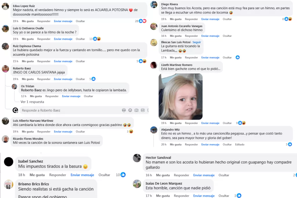 Otros comentarios apuntaron directamente al simbolismo cultural. Varios usuarios afirmaron que el verdadero himno popular sigue siendo “Acuarela Potosina”, mientras que otros señalaron que el tema oficial no conecta con la identidad local ni con la tradición musical del estado. “Mis impuestos tirados a la basura”, expresó una usuaria, sintetizando el malestar por el uso de recursos públicos.