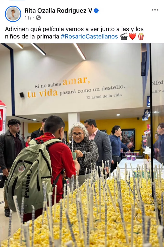 Además, vieron al diputado de Morena, Luis Emilio Rosas Montiel en el cine con Rita Ozalia Rodríguez Velázquez, según lo que publicó Rodríguez Velázquez en redes sociales, llevaron a niñas y niños de la primaria Rosario Castellanos.