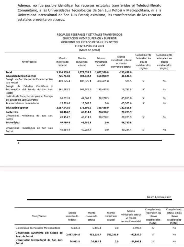 Es decir, aunque así se acordó con la Federación, el año pasado se dejó se asignar un monto de 219.4 mdp a preparatorias y universidades públicas, de los cuales 90.8 mdp correspondía a la UASLP; y 20.2 mdp a la Universidad Politécnica, esta suma representan casi el 50% de los recursos financieros que le corresponde entregar. Y las transferencias de recursos estatales que sí entregaron presentaron atrasos.