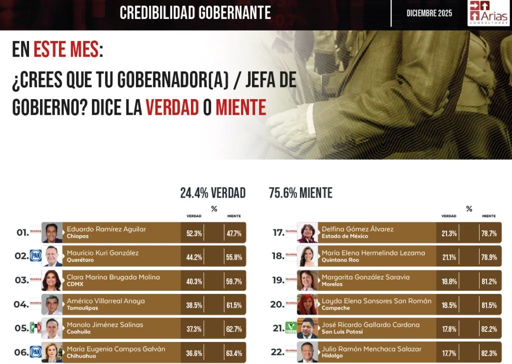 Aunque el gobernador registra un leve incremento en aprobación respecto al mes previo, el avance resulta marginal frente a un escenario dominado por la desconfianza ciudadana. La encuesta revela que 82% de las personas considera que Gallardo no dice la verdad, colocándolo entre los gobernadores con peor percepción de credibilidad en el país.