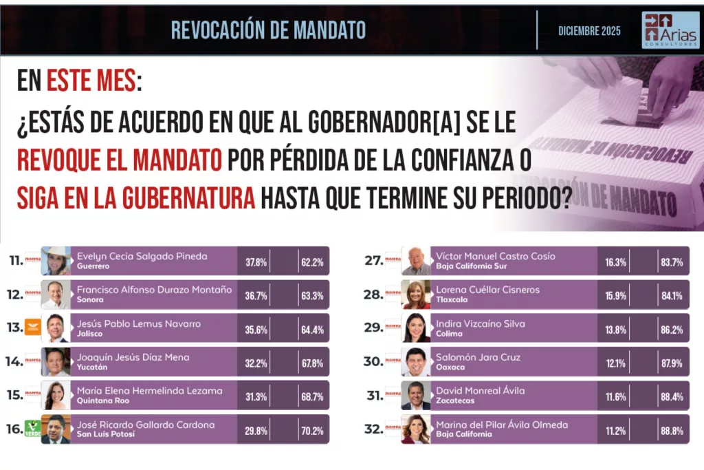 San Luis Potosí se ubica a media tabla en el ranking nacional de desempeño de gubernaturas, pero con indicadores que encienden focos rojos para la administración de Ricardo Gallardo Cardona. De acuerdo con la más reciente encuesta nacional de Arias Consultores, correspondiente a diciembre de 2025, solo 22% de la población aprueba la gestión del mandatario potosino, mientras que más de siete de cada diez ciudadanos desaprueban su desempeño.