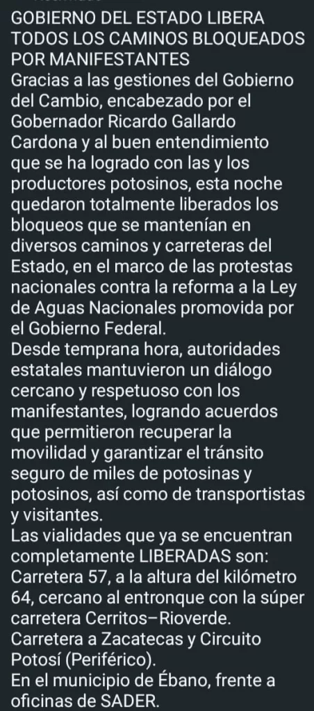 “Gobierno del Estado libera todos los caminos bloqueados por manifestantes” fue el encabezado del boletín de prensa enviado por su área de comunicación, el cual agrega que “gracias a las gestiones del Gobierno del Cambio, encabezado por el Gobernador Ricardo Gallardo Cardona y al buen entendimiento que se ha logrado con las y los productores potosinos, quedaron totalmente liberados los bloqueos que se mantenían en diversos caminos y carreteras del Estado”.