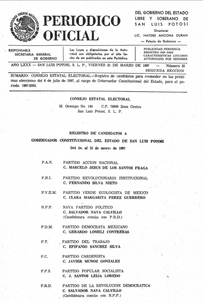 El Periódico Oficial del Estado, en su edición del 21 de marzo de 1997, muestra claramente que Clara Margarita Pérez Guerrero se registró como candidata a la gubernatura por el Partido Verde Ecologista de México (PVEM) para la elección de ese año.
