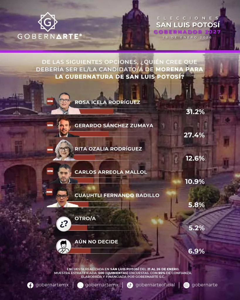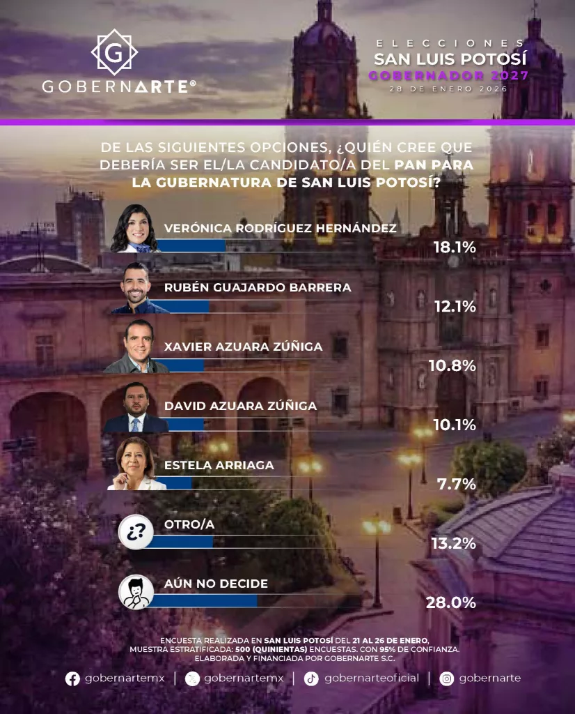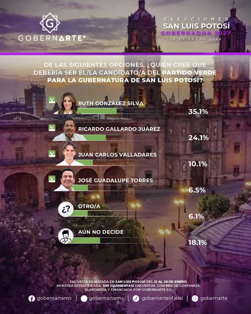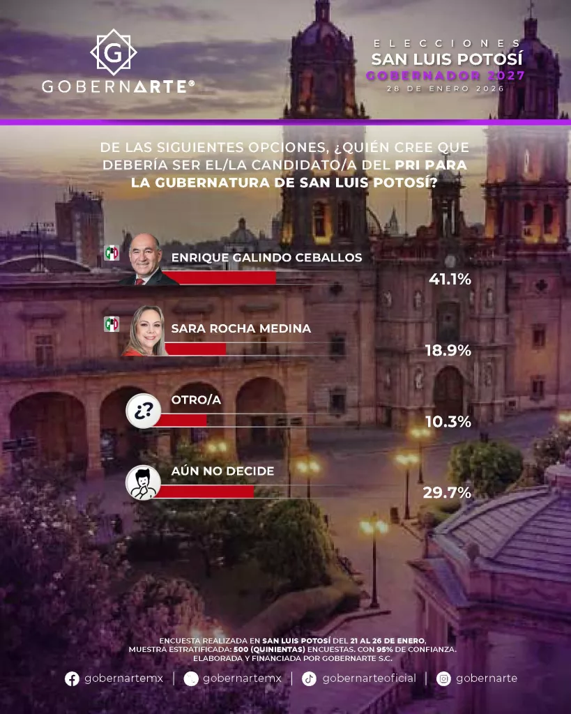 En el marco de las mediciones rumbo a la elección de gobernador de San Luis Potosí en 2027, la firma Gobernarte S.C. levantó una encuesta para conocer la percepción ciudadana sobre a quién escogerían como él o la candidata de cada partido político. El ejercicio se realizó del 21 al 26 de enero, con una muestra estratificada de 500 personas y un nivel de confianza del 95 por ciento.