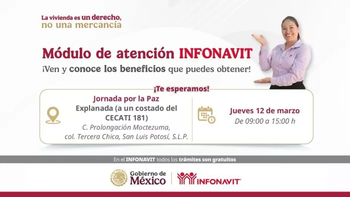 El INFONAVIT instalará módulos de atención en Ciudad Valles y San Luis Potosí capital, el próximo jueves 12 de marzo, de 09:00 a 15:00 horas, con el fin de asesorar a las y los trabajadores interesados en obtener un crédito y ofrecer alternativas de pago a quienes enfrentan dificultades para cubrir sus mensualidades.