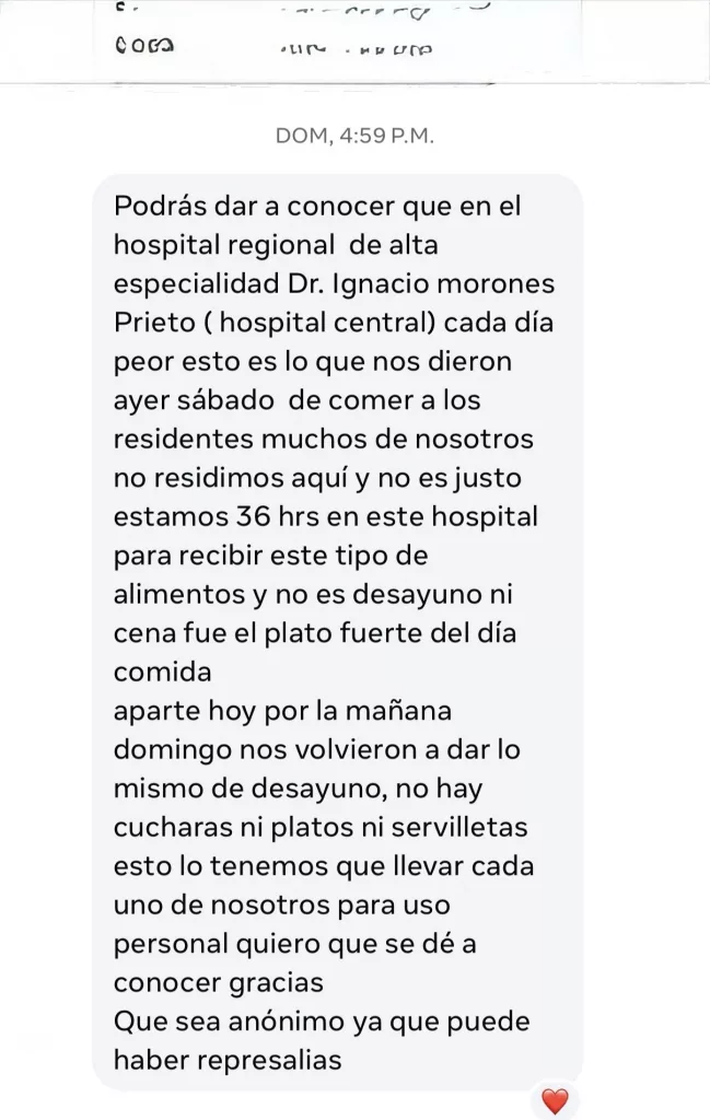 Médicos residentes del Hospital Regional de Alta Especialidad «Dr. Ignacio Morones Prieto» (Hospital Central) han manifestado su inconformidad ante las precarias condiciones de alimentación y la falta de insumos básicos de cocina que enfrentan durante sus jornadas laborales.