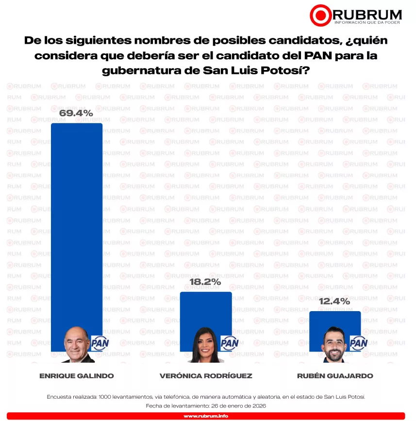En el PAN, la preferencia es contundente: Enrique Galindo concentra 69.4%, muy por encima de Verónica Rodríguez (18.2%) y Rubén Guajardo (12.4%), lo que lo perfila como el aspirante mejor posicionado dentro del blanquiazul.