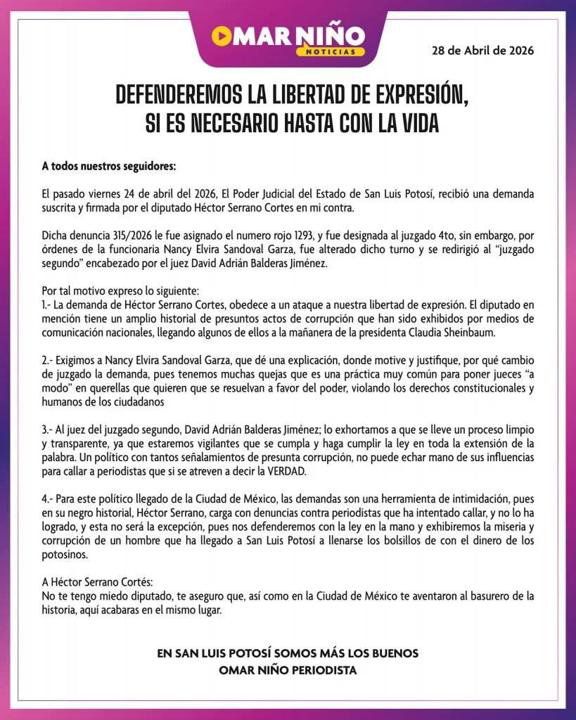El periodista potosino Omar Niño denunció públicamente la existencia de una demanda en su contra presentada por el diputado Héctor Serrano Cortés ante el Poder Judicial del Estado de San Luis Potosí el pasado viernes 24 de abril.