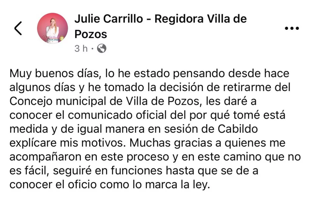 La regidora Julie Carrillo anunció este jueves su decisión de separarse del Concejo Municipal de Villa de Pozos, confirmó su renuncia a través de un mensaje que difundió en sus redes sociales.