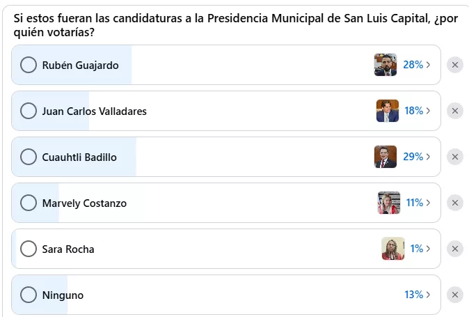 Una encuesta difundida en las redes sociales de Central San Luis entre los días 9 y 11 de enero de 2025, sobre eventuales candidaturas a la Presidencia Municipal de San Luis Potosí Capital muestra un escenario cerrado y fragmentado entre los principales aspirantes, con una diferencia mínima entre los dos primeros lugares.