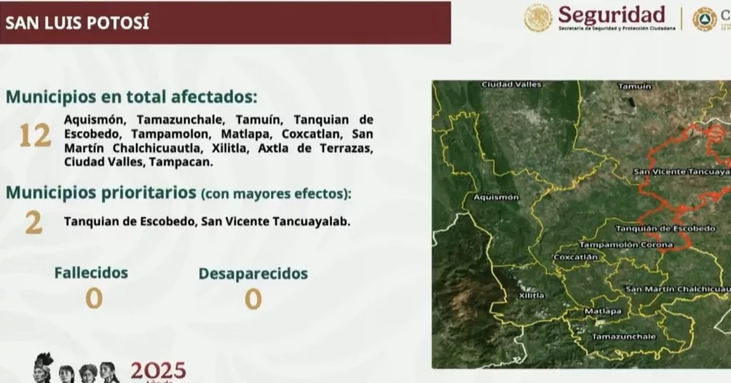 Según el reporte oficial, las zonas más afectadas fueron Tanquián de Escobedo y San Vicente Tancuayalab, junto con Aquismón, Tamazunchale, Tamuín, Tampamolón, Matlapa, Coxcatlán, San Martín Chalchicuautla, Xilitla, Axtla de Terrazas, Ciudad Valles y Tampacán.