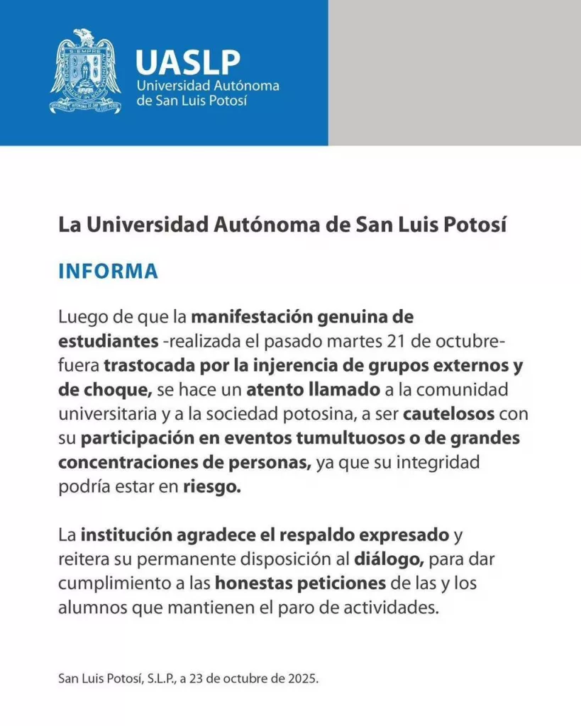 En un comunicado oficial, que publicaron en redes sociales, la institución hizo un llamado a la comunidad universitaria y a la sociedad potosina a actuar con cautela ante la participación en eventos multitudinarios o concentraciones masivas, debido a que podrían representar un riesgo para la integridad de aquellos que participen.