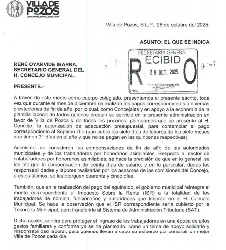 La Comisión de Hacienda de Villa de Pozos aprobó una adecuación presupuestal que permitirá otorgar prestaciones extraordinarias de fin de año a todo el personal municipal, incluidos los 12 concejales, quienes recibirán un paquete de beneficios que supera los 200 mil pesos por persona.