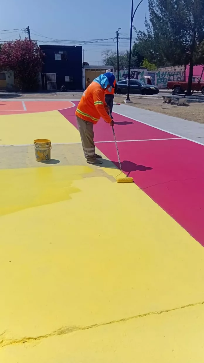La dependencia dio a conocer que, por otra parte, para conservar espacios públicos más limpios, seguros y en mejores condiciones, se trabajó en la pintura de la cancha del Parque Fertilizantes en la colonia 20 de Noviembre.