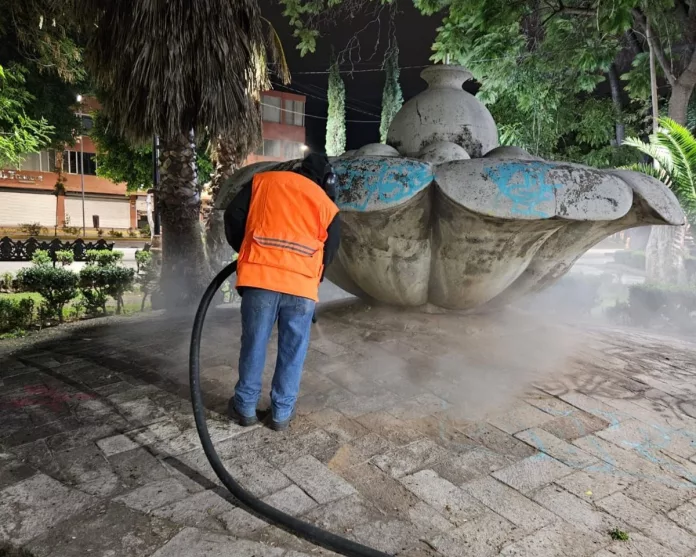 Personal de la Dirección de Servicios Municipales trabajó en la limpieza intensiva de la fuente dedicada a las madres potosinas, donde además de la limpieza general se utilizó maquinaria especial para eliminar el grafiti.