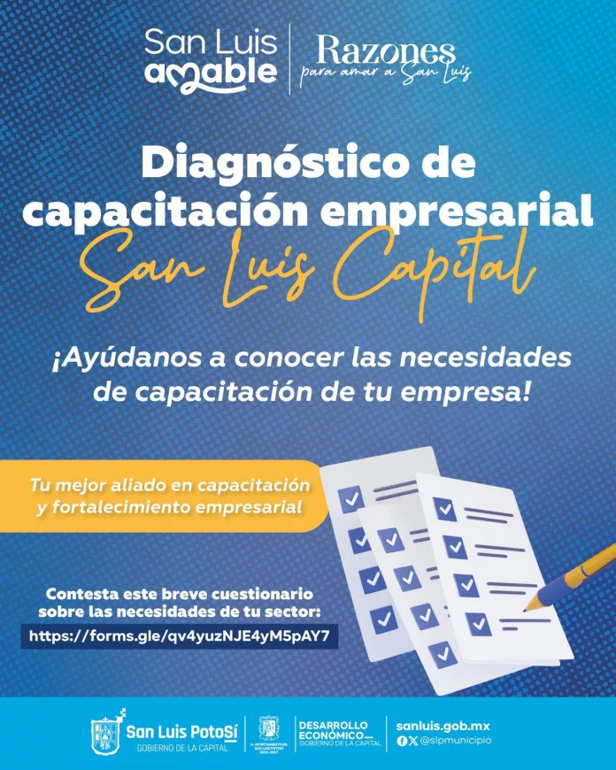 La encuesta está disponible en línea y puede responderse de manera sencilla y rápida en la siguiente liga: (https://forms.gle/qv4yuzNJE4yM5pAY7). El Gobierno de la Capital reitera su compromiso de trabajar de la mano con el sector empresarial para impulsar el desarrollo económico y generar mejores condiciones para el crecimiento de los negocios locales. #SanLuisAmable