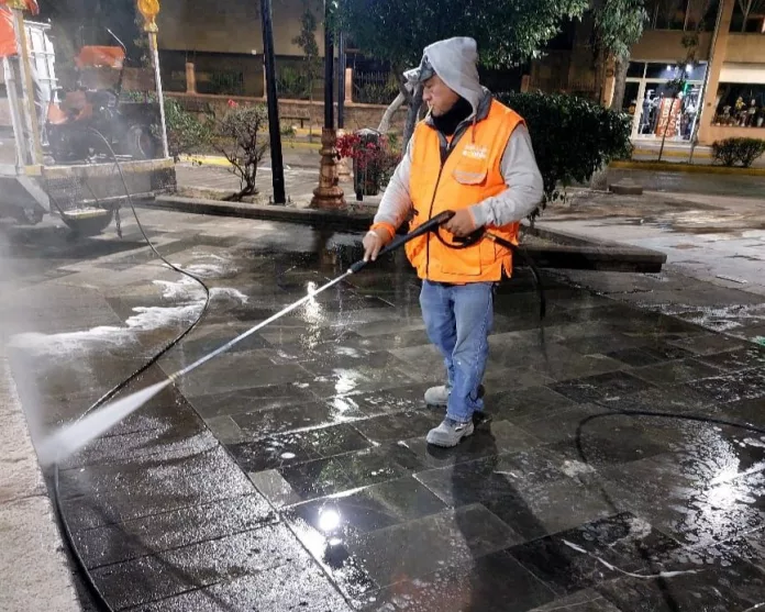 La Dirección de Servicios Municipales informó que se realizan labores de limpieza a fondo con el uso de máquinas de hidrolavado para retirar la suciedad acumulada en los pisos de cantera, tanto del circuito exterior como de los andadores del interior.