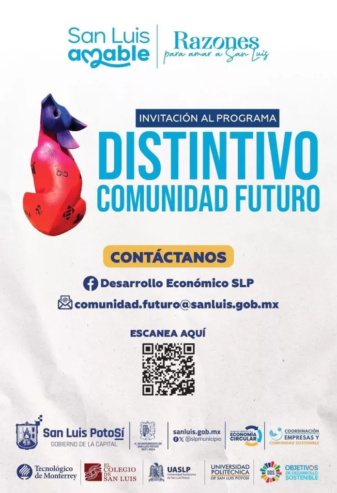El Gobierno de la Capital invita a todas las empresas potosinas participar para obtener el distintivo Comunidad Futuro en su edición 2026, inicitiva del alcalde Enrique Galindo Ceballos con el propósito de fomentar la competitividad, la sostenibilidad y la responsabilidad social.