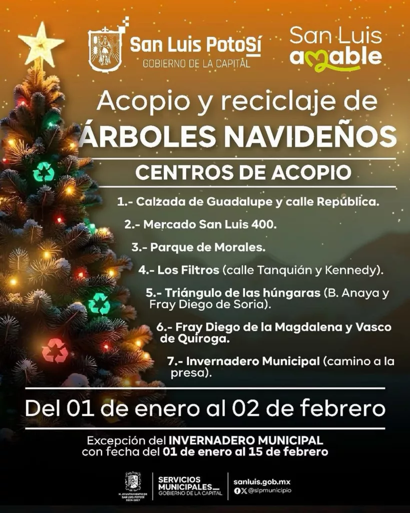 Con el fin de mantener limpia la ciudad, promover el cuidado del medio ambiente y darle un uso sustentable a los árboles navideños naturales, el Gobierno Municipal puso en servicio 7 centros de acopio ubicados en diversos puntos, donde se convertirán en composta para el mantenimiento de áreas verdes.