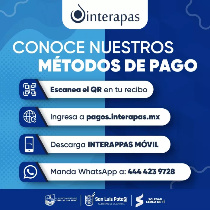 Para quienes prefieren el pago presencial, INTERAPAS cuenta con cajas recaudadoras ubicadas en distintos puntos de la ciudad y en los municipios de Soledad de Graciano Sánchez, Cerro de San Pedro y Villa de Pozos, así como en las delegaciones de La Pila y Bocas.
