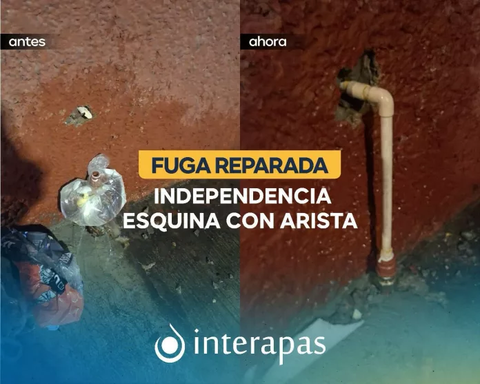 La noche de este martes, personal de INTERAPAS reparó una fuga de agua potable en la calle Independencia, esquina con Arista, en pleno Centro Histórico, con el fin de evitar el desperdicio y proteger la infraestructura del primer cuadro de la ciudad.