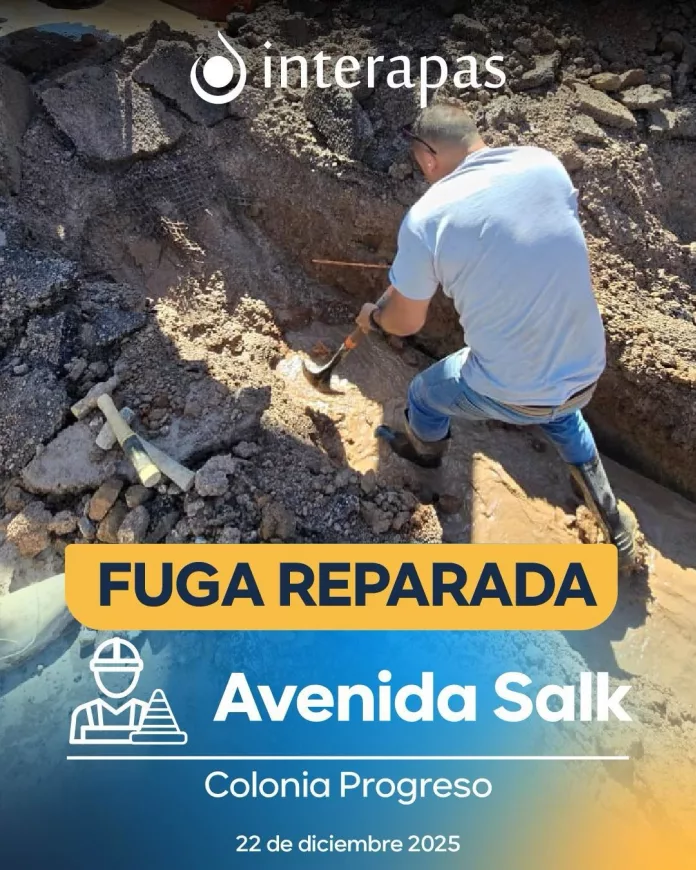 Durante el fin de semana, personal de INTERAPAS atendió y reparó una fuga de agua potable en avenida Salk, colonia Progreso, entre las calles Gregg y Graf, frente a un plantel educativo.