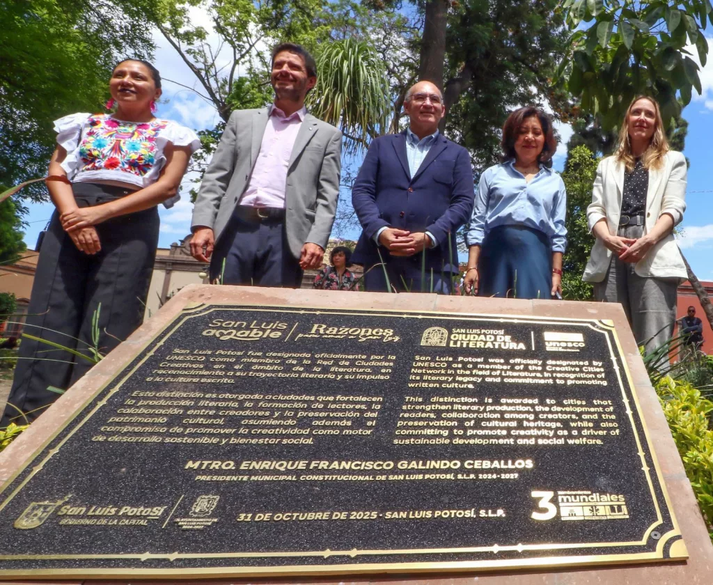 Tras el evento protocolario, los escritores potosinos, el representante de la UNESCO y el Presidente Municipal, develaron la placa en el emblemático Jardín de San Francisco, junto a las placas por los nombramientos, en 2010 como Ciudad Patrimonio y en 2024 como Ciudad del Aprendizaje.