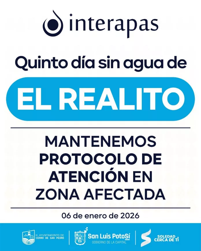 En el quinto día sin suministro del sistema “El Realito”, correspondiente a la primera interrupción registrada en 2026, INTERAPAS continúa aplicando su protocolo de atención para mitigar los efectos de la falta de agua en las zonas abastecidas por esta fuente.