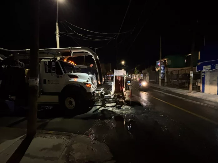 Los trabajos se realizaron durante la noche, como parte de la atención inmediata a los reportes e incluyeron labores de limpieza y desaloje en 250 metros de tubería sanitaria a través de cinco pozos de visita. Durante la intervención se retiró un tapón de grasa de más de 100 kilos, lo que permitió bajar los niveles en la red y restablecer su funcionamiento.