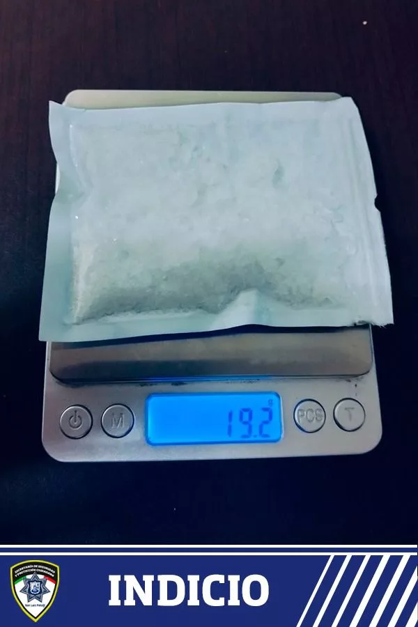 En su intento por evadir el contacto policial, el joven arrojó al suelo una bolsa de plástico transparente que tenía en su interior un polvo blanco con características a la droga conocida como cristal con un peso aproximado de 19.2 gramos.